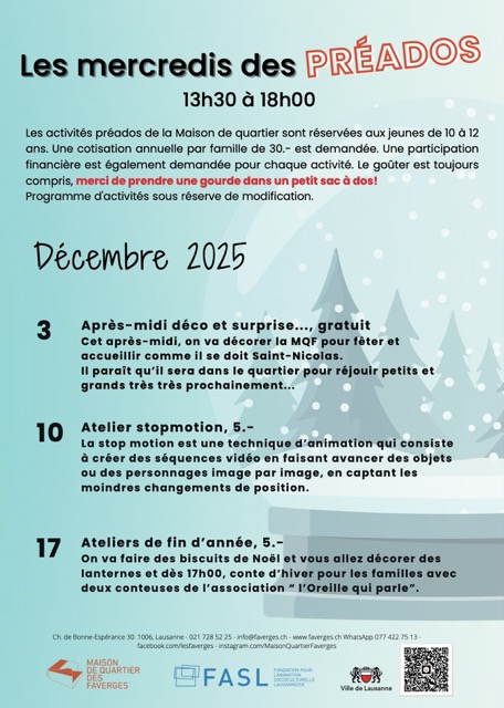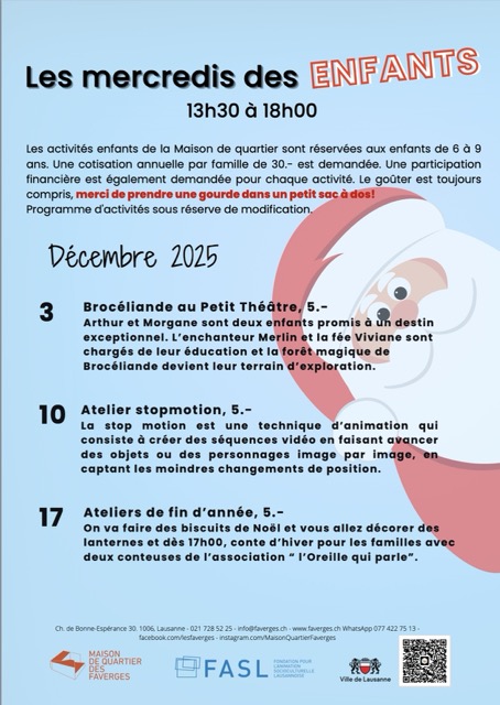 Programme des mercredis du mois de décembre 2025 pour les enfants et les préados et ados.